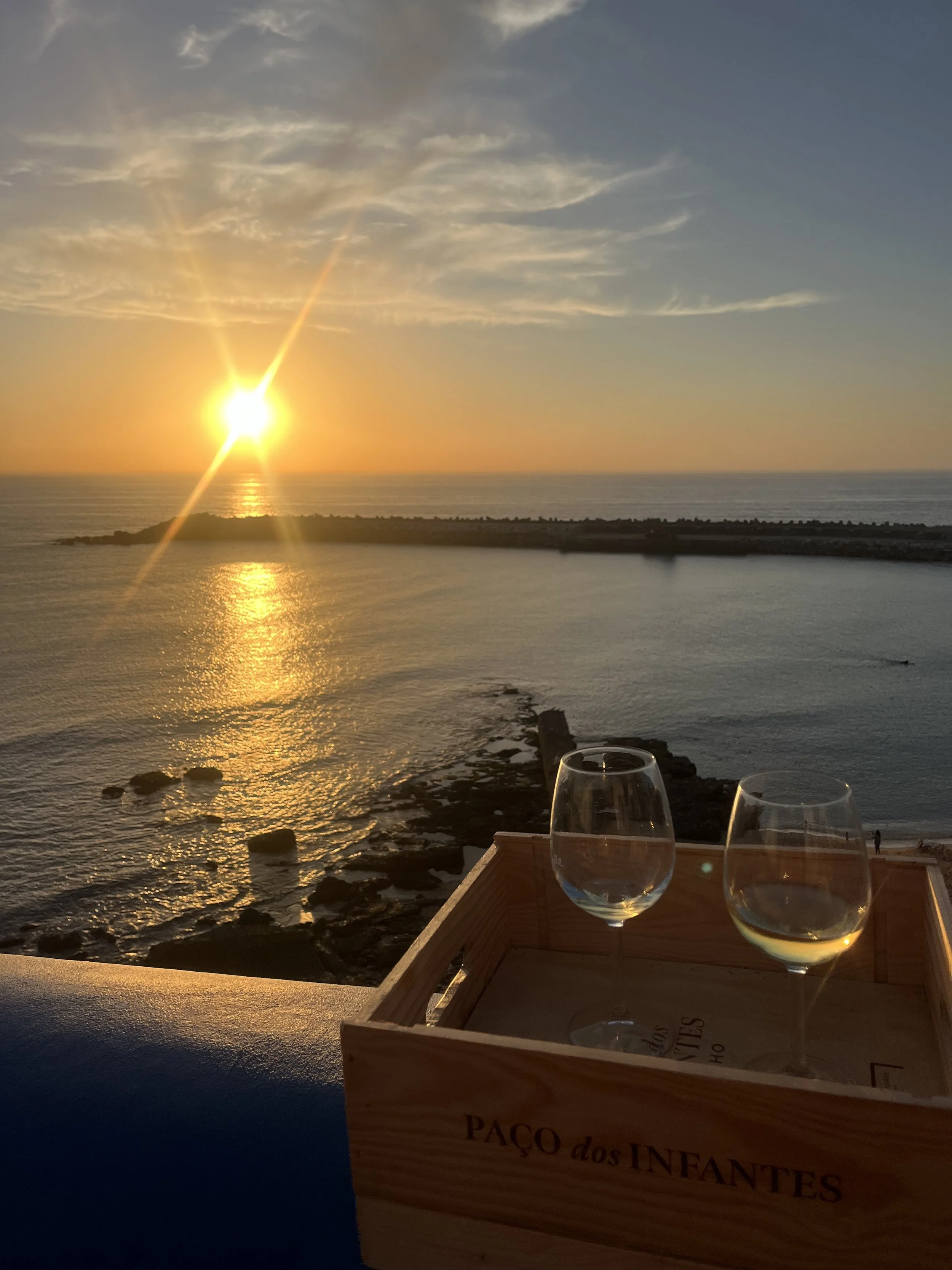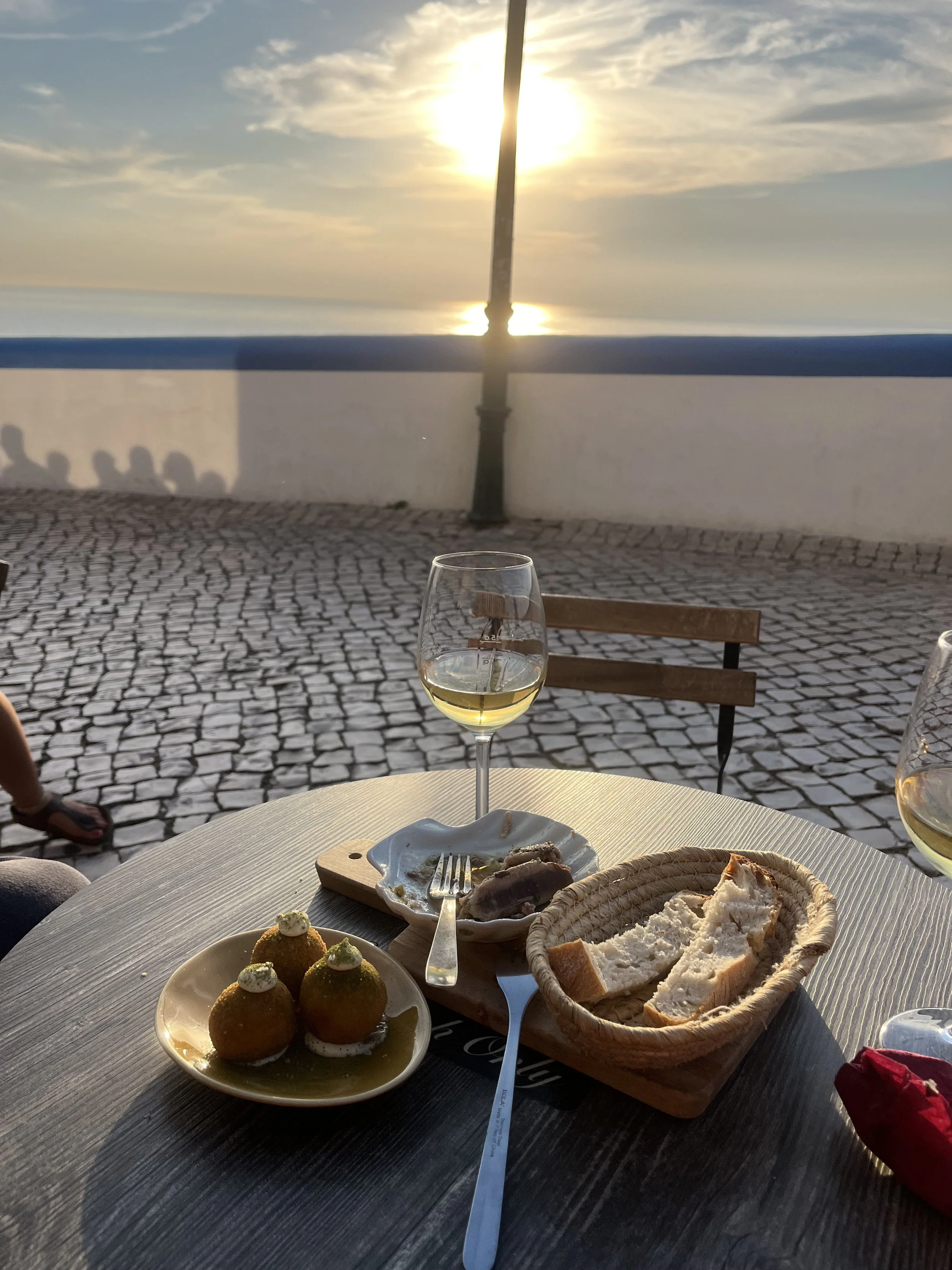 Mar das Latas // This is a small restaurant and wine bar that’s cash only where you can sit and watch the sun set. (Pictured!) You can also stand and watch the sun set, and they’ll give you an empty wine crate that’s been sawed down to nestle perfectly on the ledge that separates the street from the sea. Every sunset, a crowd gathers around Mar das Latas as people have a glass of vinho verde and watch another gorgeous day in Ericeira come to a close.